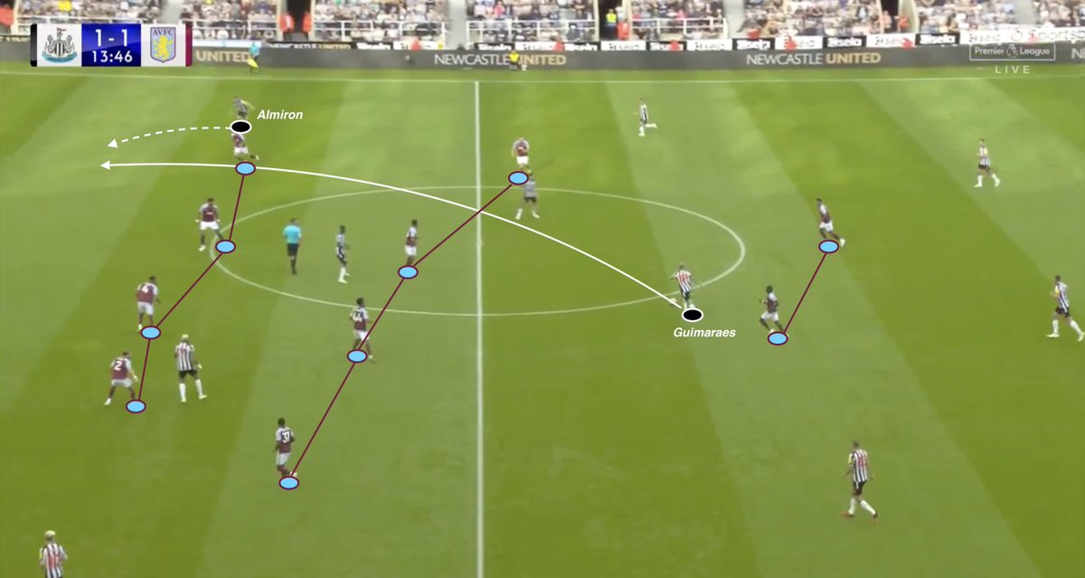Some things don’t change between seasons : and Newcastle pressing is still suffocating, doesn’t let any time to the opponent to build-up properly. The fact Guimaraes and Tonali step up to complete the second line of press makes short passes difficult for Aston Villa.