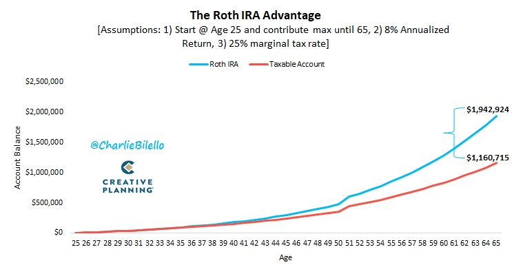 Grows tax-free, withdrawals are tax-free, and no required minimum distributions. Advantage over taxable account is enormous.