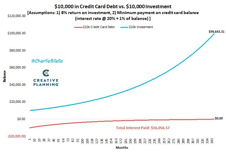 Making the minimum payment on $10k in credit card debt would cost you over $16k in interest before the balance is paid off.