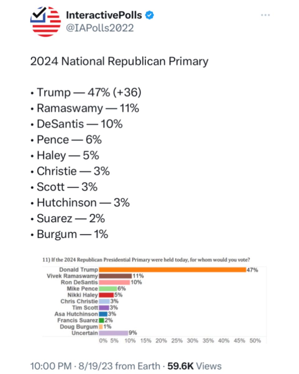 Two months ago in June DeSantis fell 34 points to Trump - still garnering 26% Today in August, Trump is up on DeSantis over 63 points while DeSantis is now polling at 10% - both an all time high for Trump and all time Low for DeSantis DeSantis now trails Vivek Ramaswamy as well