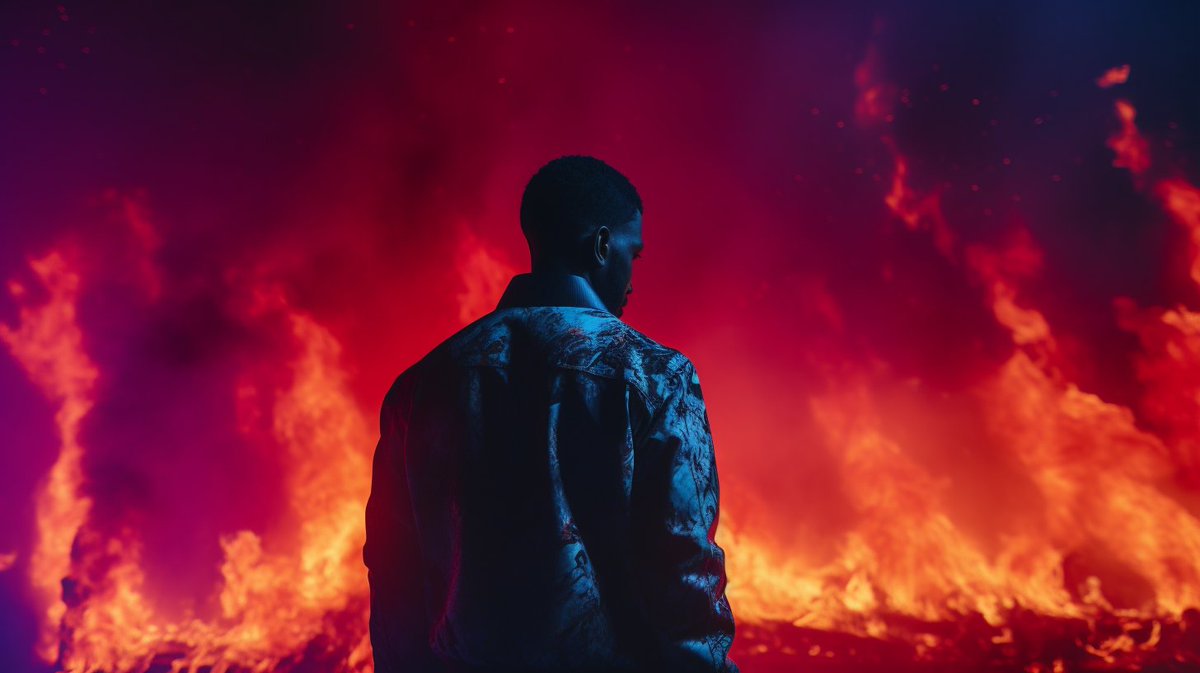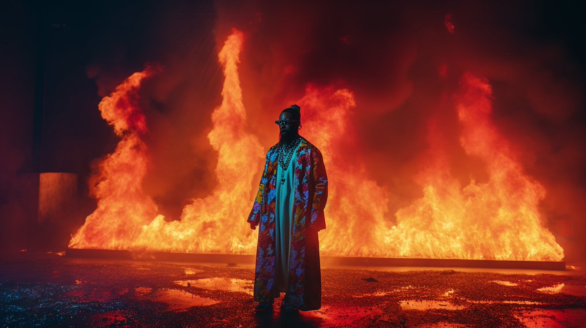 💬 'Found Footage' photo. Technicolor film. 'Dark & Neon' coloring. A man wearing gucci standing in front of a massive fire. Moody Midnight Hour. --style raw --ar 16:9