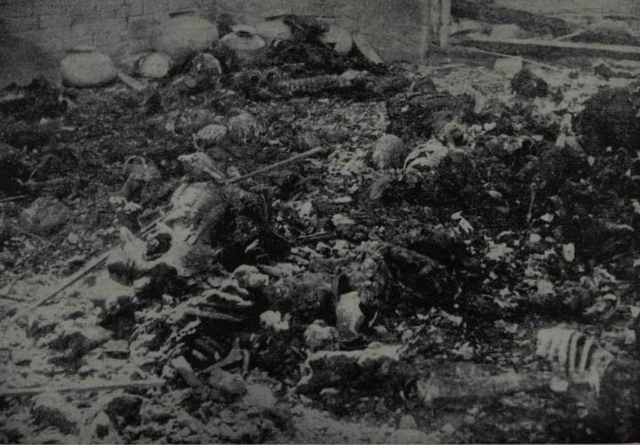 Photo of Gurdwara at Dubehran: where 200 non-mslm Men, women, and children were buπned alive. tore the limbs, ßones, and skulls of non-Mslms lying inside the Gurdwara. True photo of the Mslm-Sikh Brotherhood.