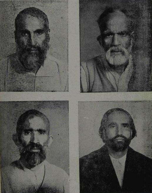 Photo of Skh men whose kesh (hair) were shaved for conversion, and another photo of heaps of burnt bodies in the main hall of Bewal Gurdwara.