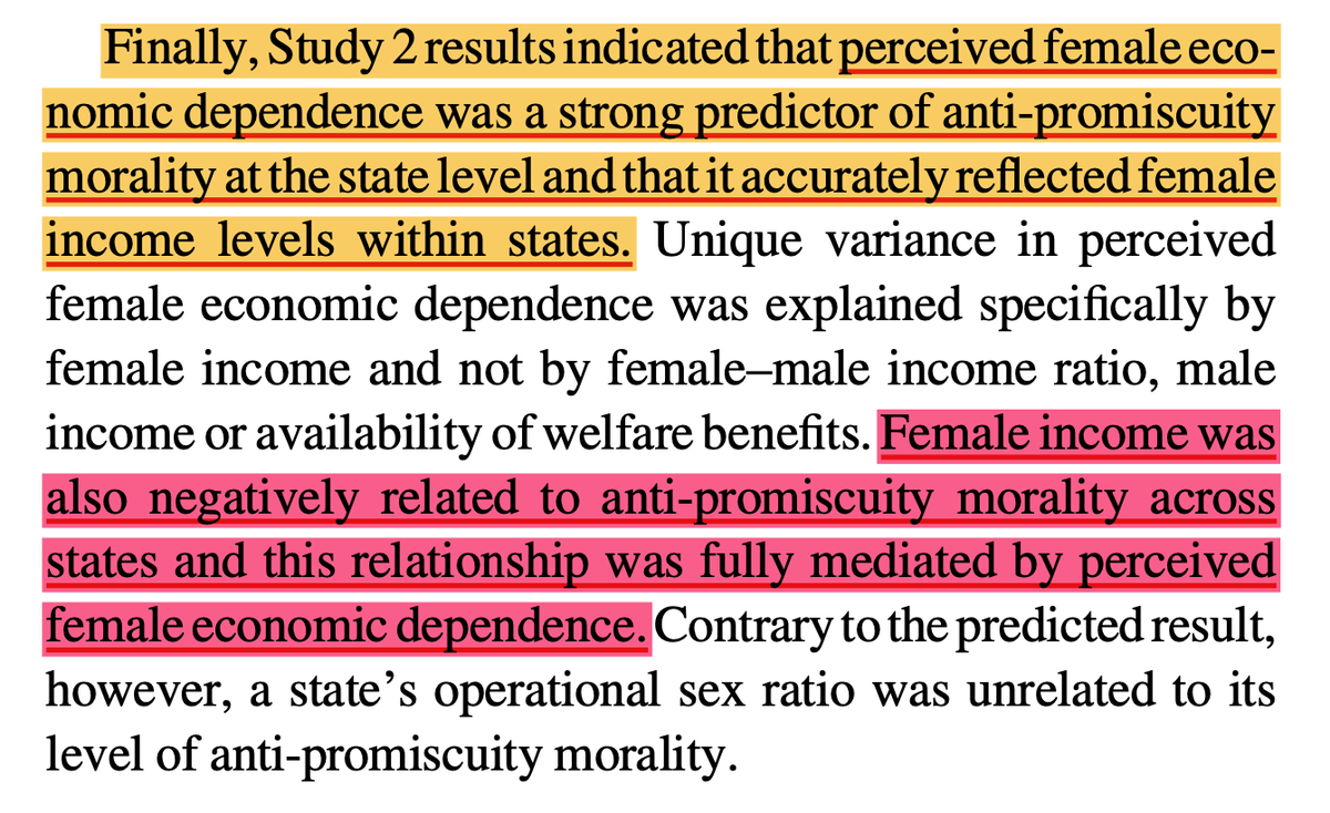 Therefore it can be concluded that female economic independence leads to less moral aversion towards promiscuity.