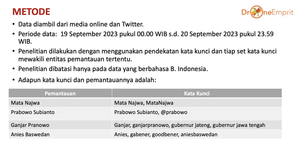 - Penelitian dilakukan dengan menggunakan pendekatan kata kunci dan tiap set kata kunci mewakili entitas pemantauan tertentu.