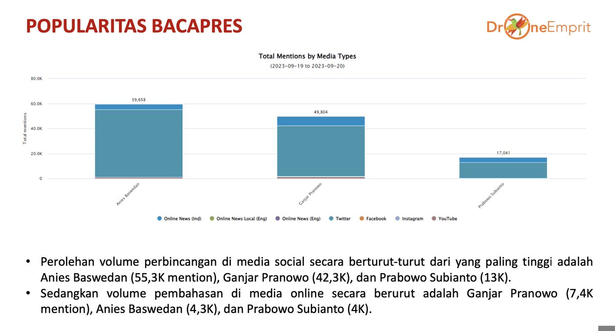 - Sedangkan volume pembahasan di media online secara berurut adalah Ganjar Pranowo (7,4K mention), Anies Baswedan (4,3K), dan Prabowo Subianto (4K).
