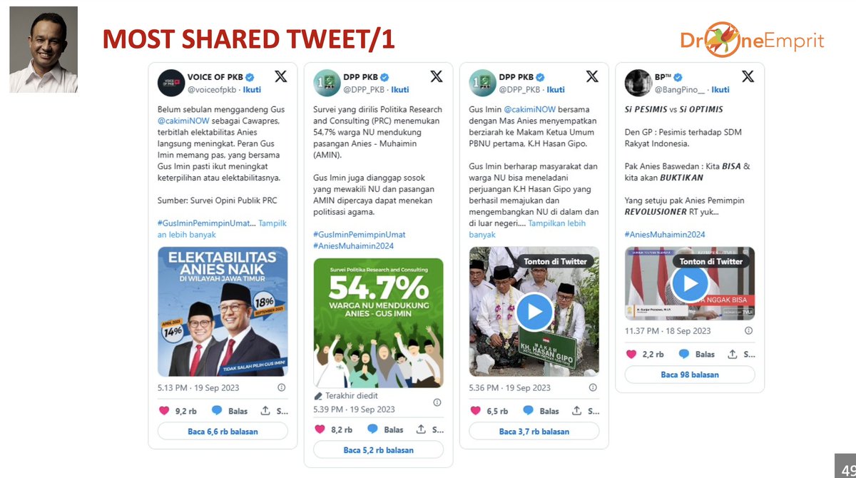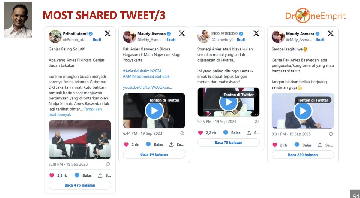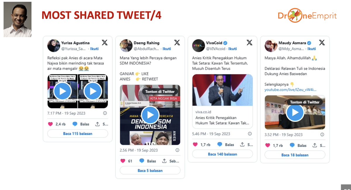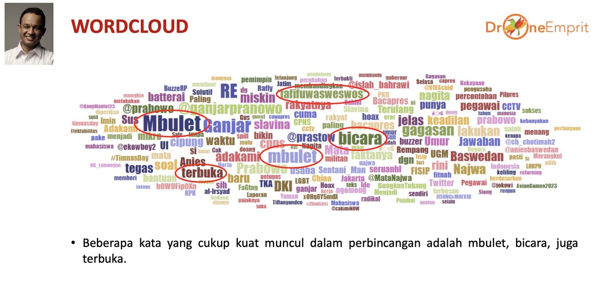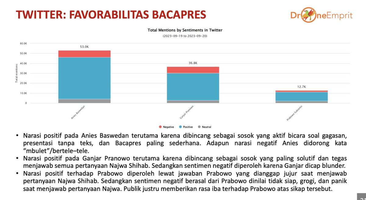 - Narasi positif pada Anies Baswedan terutama karena dibincang sebagai sosok yang aktif bicara soal gagasan, presentasi tanpa teks, dan Bacapres paling sederhana. Adapun narasi negatif Anies didorong kata “mbulet”/bertele–tele.