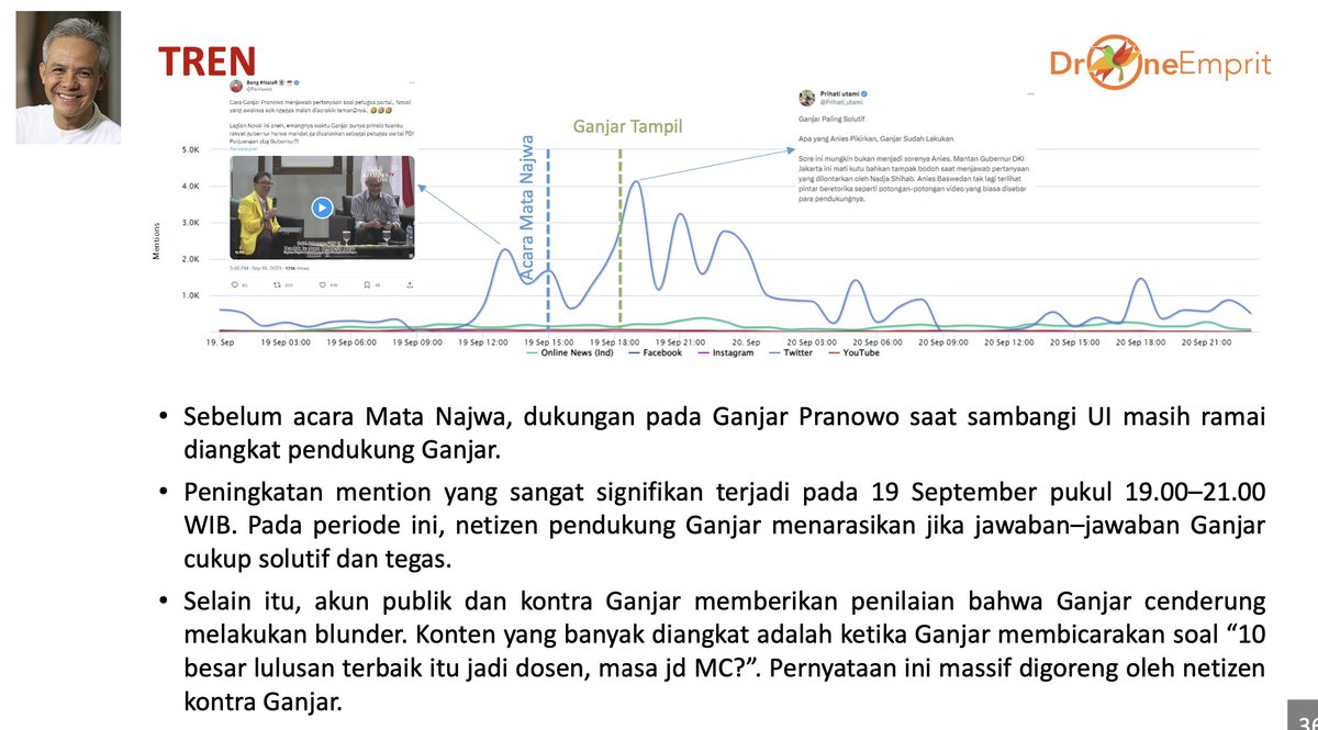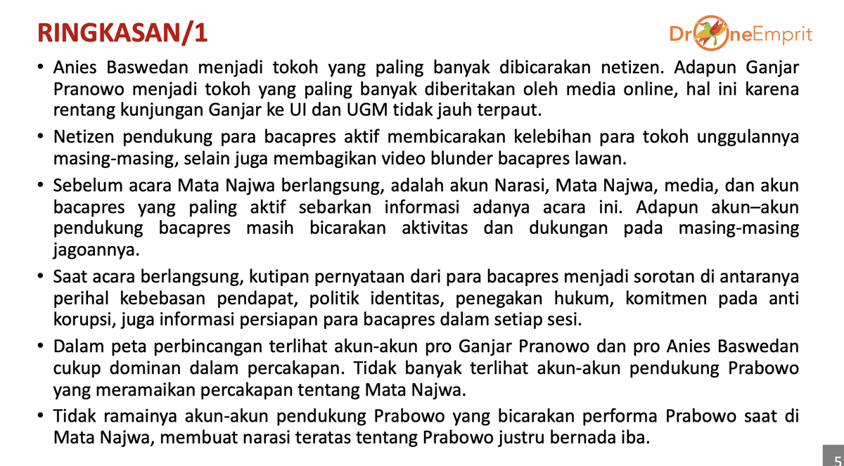 1/ Anies Baswedan menjadi tokoh yang paling banyak dibicarakan netizen. Adapun Ganjar Pranowo menjadi tokoh yang paling banyak diberitakan oleh media online, hal ini karena rentang kunjungan Ganjar ke UI dan UGM tidak jauh terpaut.