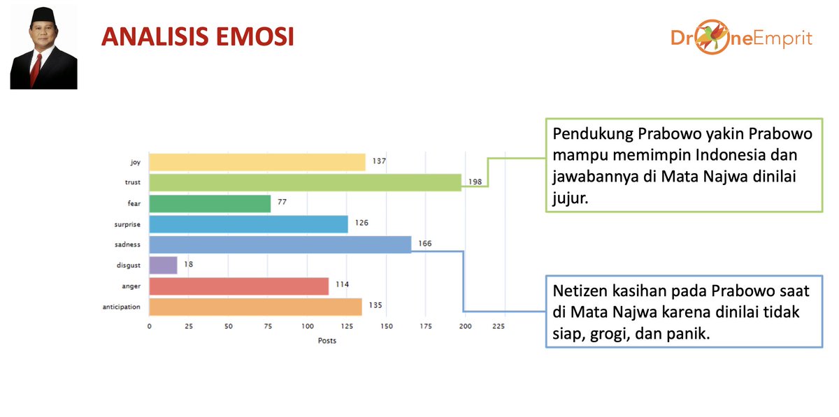 - Narasi positif terhadap Prabowo diperoleh lewat jawaban Prabowo yang dianggap jujur saat menjawab pertanyaan Najwa Shihab. Sedangkan sentimen negatif berasal dari Prabowo dinilai tidak siap, grogi, dan panik saat menjawab pertanyaan Najwa. Publik justru memberikan rasa iba terhadap Prabowo atas sikap tersebut.