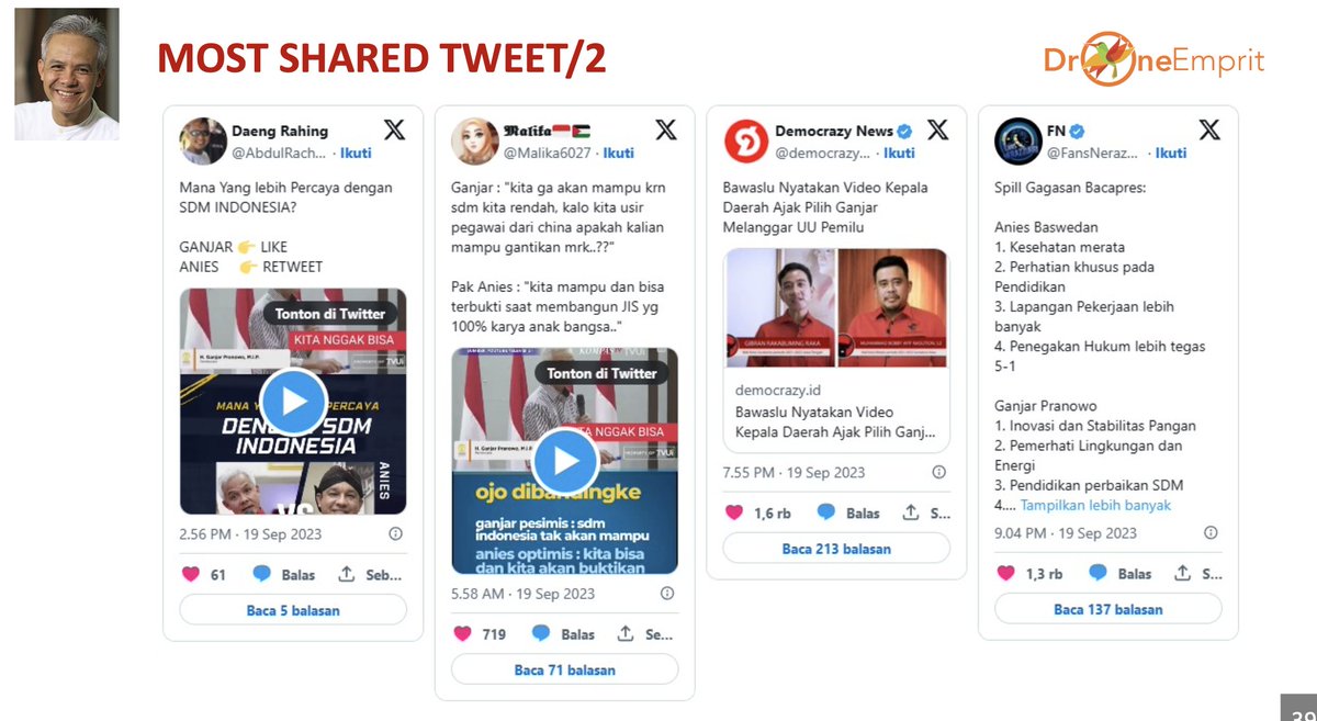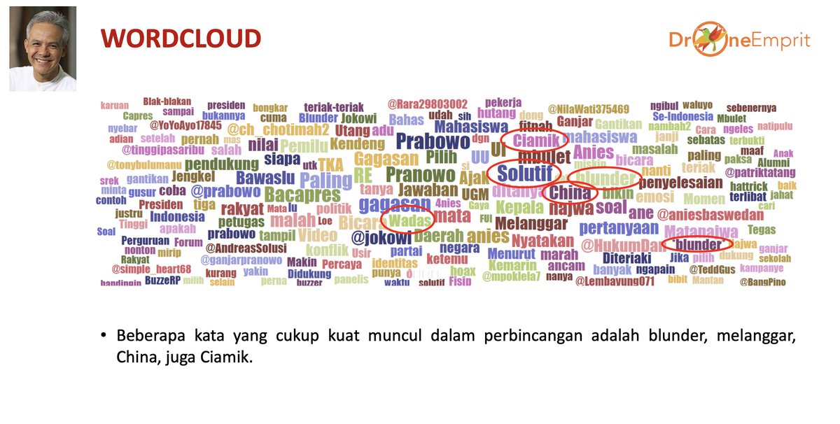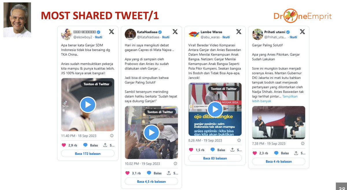 - Selain itu, akun publik dan kontra Ganjar memberikan penilaian bahwa Ganjar cenderung melakukan blunder. Konten yang banyak diangkat adalah ketika Ganjar membicarakan soal “10 besar lulusan terbaik itu jadi dosen, masa jd MC?”. Pernyataan ini massif digoreng oleh netizen kontra Ganjar.