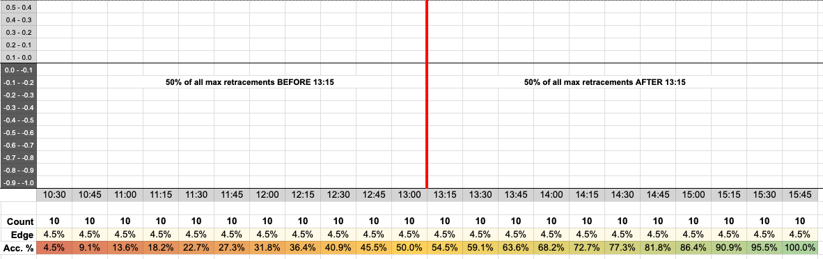 Imagine it's now exactly 1:15 p.m. Then we could say with absolute certainty that exactly half of all max retracements at this time have already been formed, right?
