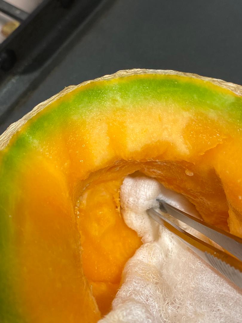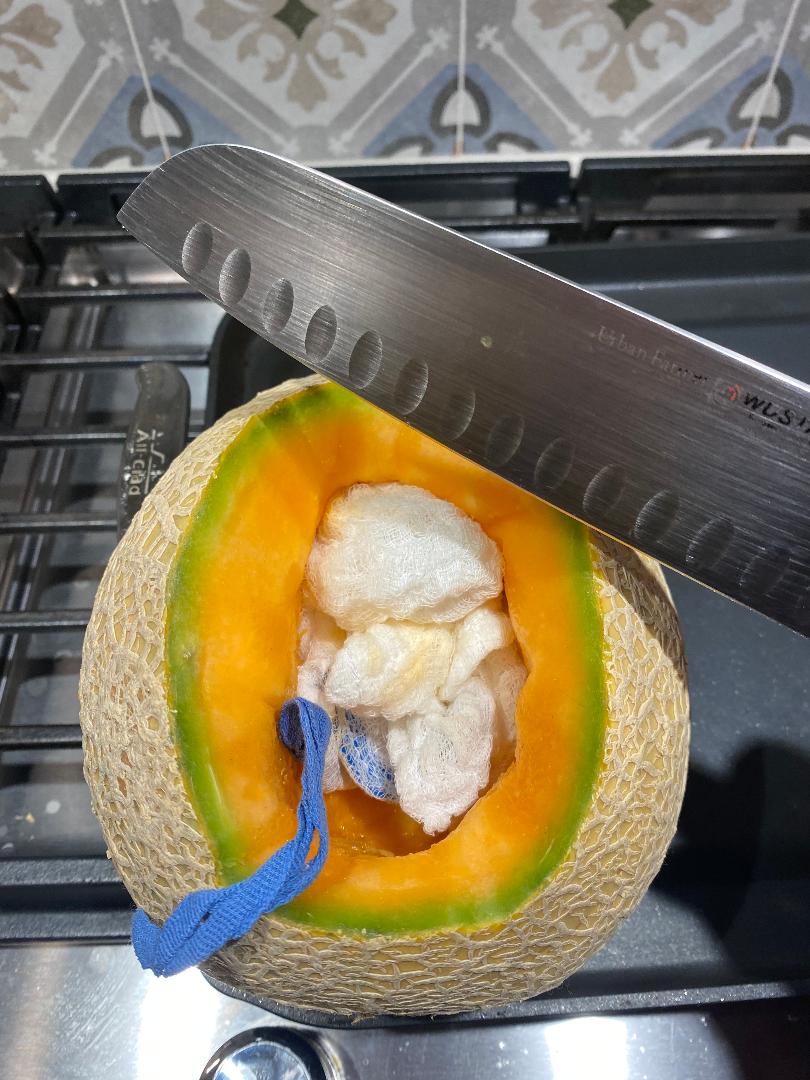 Let us see what can happen if I pack the cavity using a cursory and imprecise technique, as in the video I just showed. Here I have shoved a laparotomy pad ('swab') in there with little attention to technique. Now I am going to section the cantaloupe and see what it looks like.