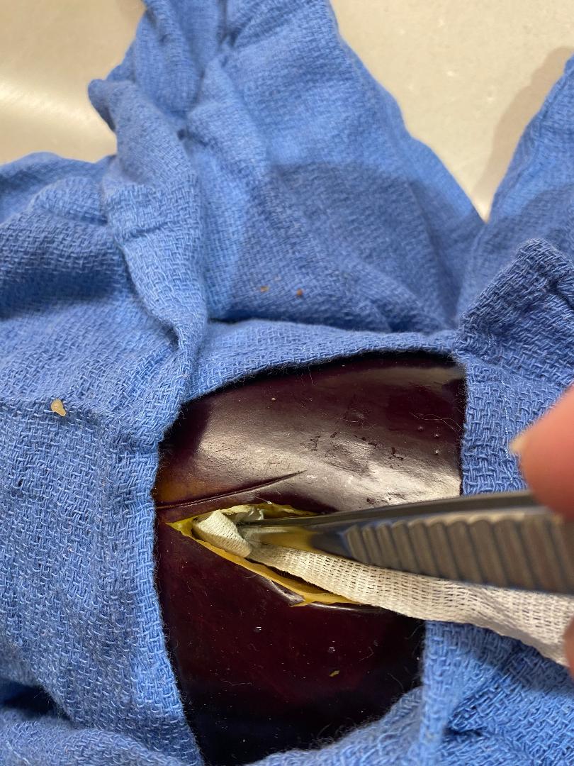 The same principle also applies to the initial packing of abscess cavities. Here I will use an eggplant model. Abscesses are often fairly vascular, and may tend to bleed, so the very first packing may need to be fairly tight. Elliptical incisions are favored (R picture).