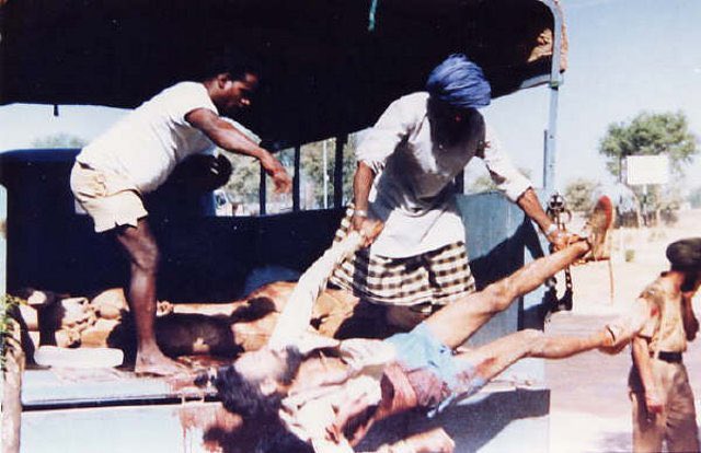 that slightly hit his forehead. When the police were picking up the dead bodies and throwing them in the van, DAV RAJ SHARMA kicked the body of Ravinderpal Singh and ordered his men to throw him in the van also.To hide its criminality the INDIA POLICE opened