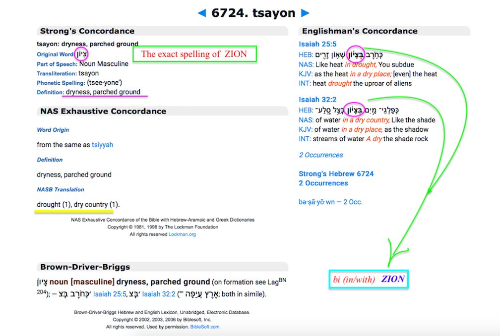 ZION (tsiyun Χ¦ΧΧΧ) also means a dry land, desert, wilderness.. in hebrew, also: 'midbar ΧΧΧΧ¨' and 'arabah Χ’Χ¨ΧΧΧ'(literally-Arabia)..