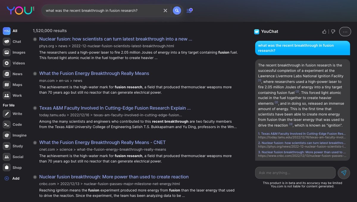 youChat has similar capabilities as #chatGPT but advances the AI field of large language models by incorporating the you search and app platform. youChat knows about recent events and can provide citations for its answers.