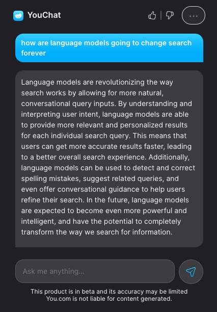 youChat responds to your prompts like an AI sidekick that reads, writes, and summarizes information for you.