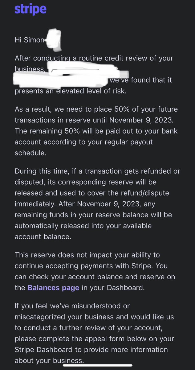 • email from stripe 50% hold until nov 9
