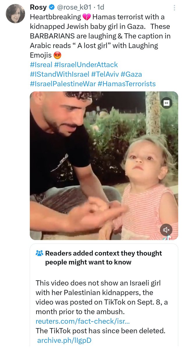 This video, viewed 760,000 times, falsely claims to show one of the Israeli children taken hostage by Hamas militants.