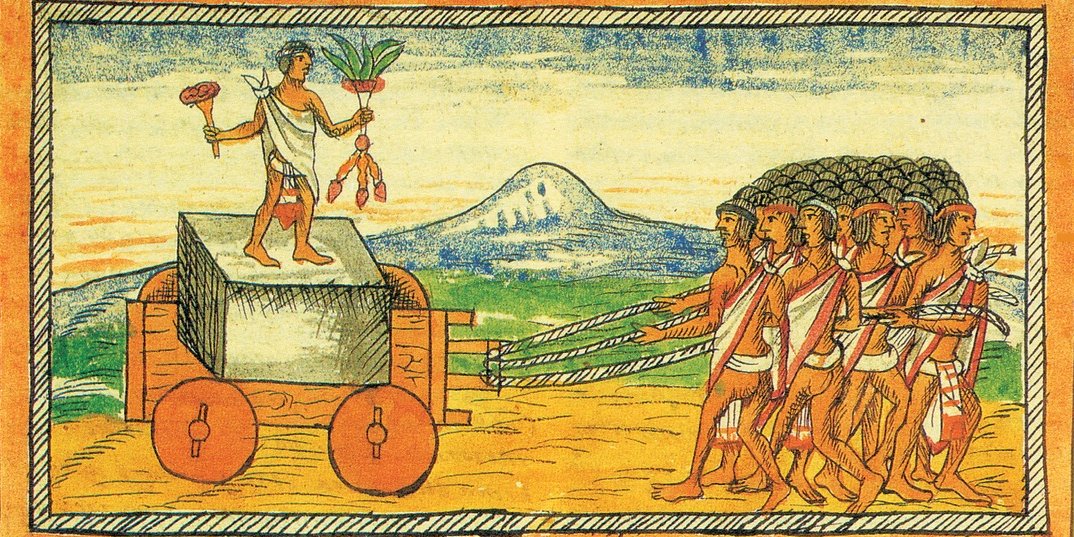 One is that the tlacuilo could not imagine any way to transport that stone other than by cart, but he made the conscious decision not to use a colonial reference.