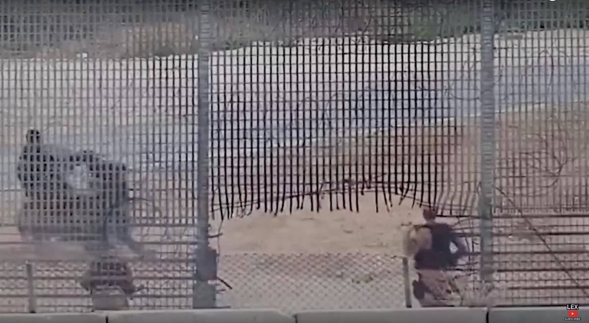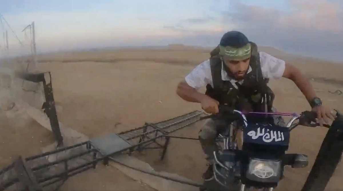 In the next shot, the motorcyclists pass through a hole cut in what looks like the second fence. Either side of the gap stand men who, in contrast to the motorcyclists, appear to be dressed in military uniforms and flak jackets similar to those worn by the Israel Defense Forces.