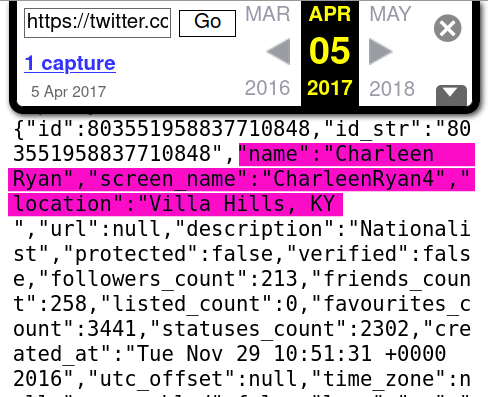 @socialistdogmom Next, we checked archives of the oldest Twitter account (@/CharleenRyan4) for more hints. The archives showed the old public profile information for “Charleen Ryan” of Villa Hills, Kentucky.
