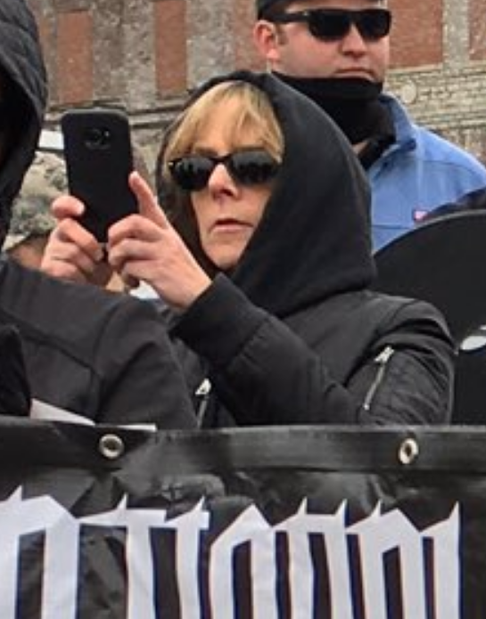 @socialistdogmom We also caught a glimpse of Charleen's blonde fringe behind a National Socialist Movement banner at a "White Lives Matter" rally in Shelbyville, Tennessee.