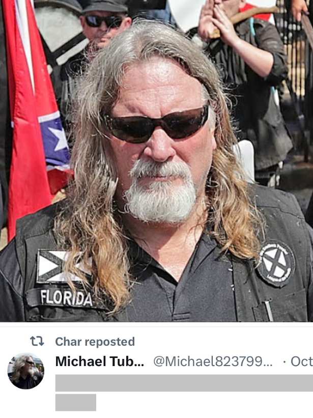 @socialistdogmom @murphtracks @Hatewatch Charleen reposts Michael Ralph Tubbs, the Florida LOS leader who tried to "instigate a race war" and served four years in prison for theft of munitions from the US military.