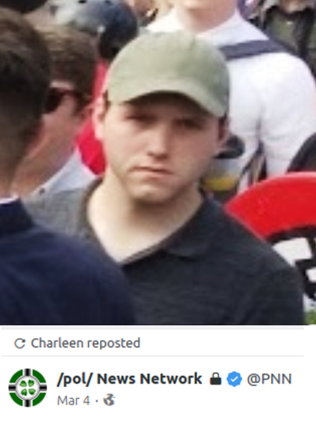 @socialistdogmom @murphtracks @Hatewatch Charleen re-Gabbed a post for /pol/ News Network, another Twitter personality whose identity was revealed as Unite the Right attendee Logan Smith. #LightGreenHatUTR