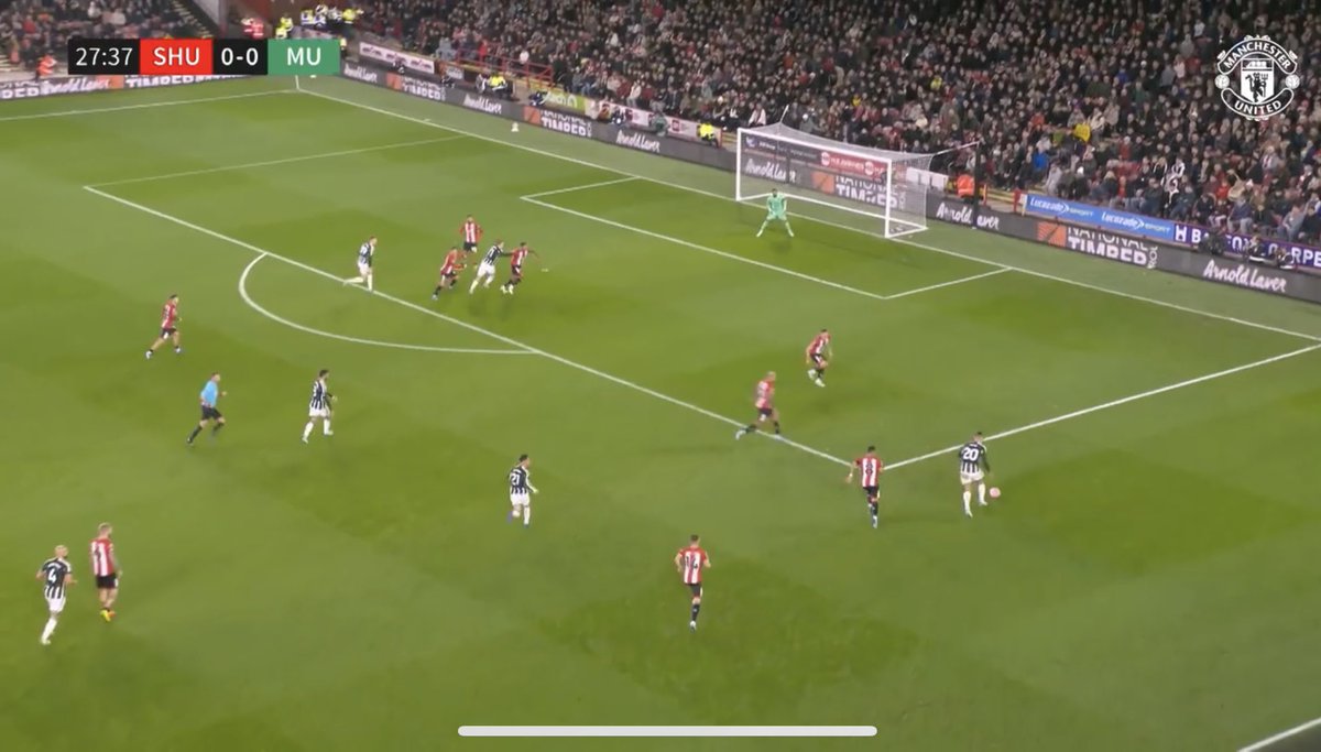 - Ball recycled by Rashford, plays to the Inverted Lindelof who finds Bruno in the pocket