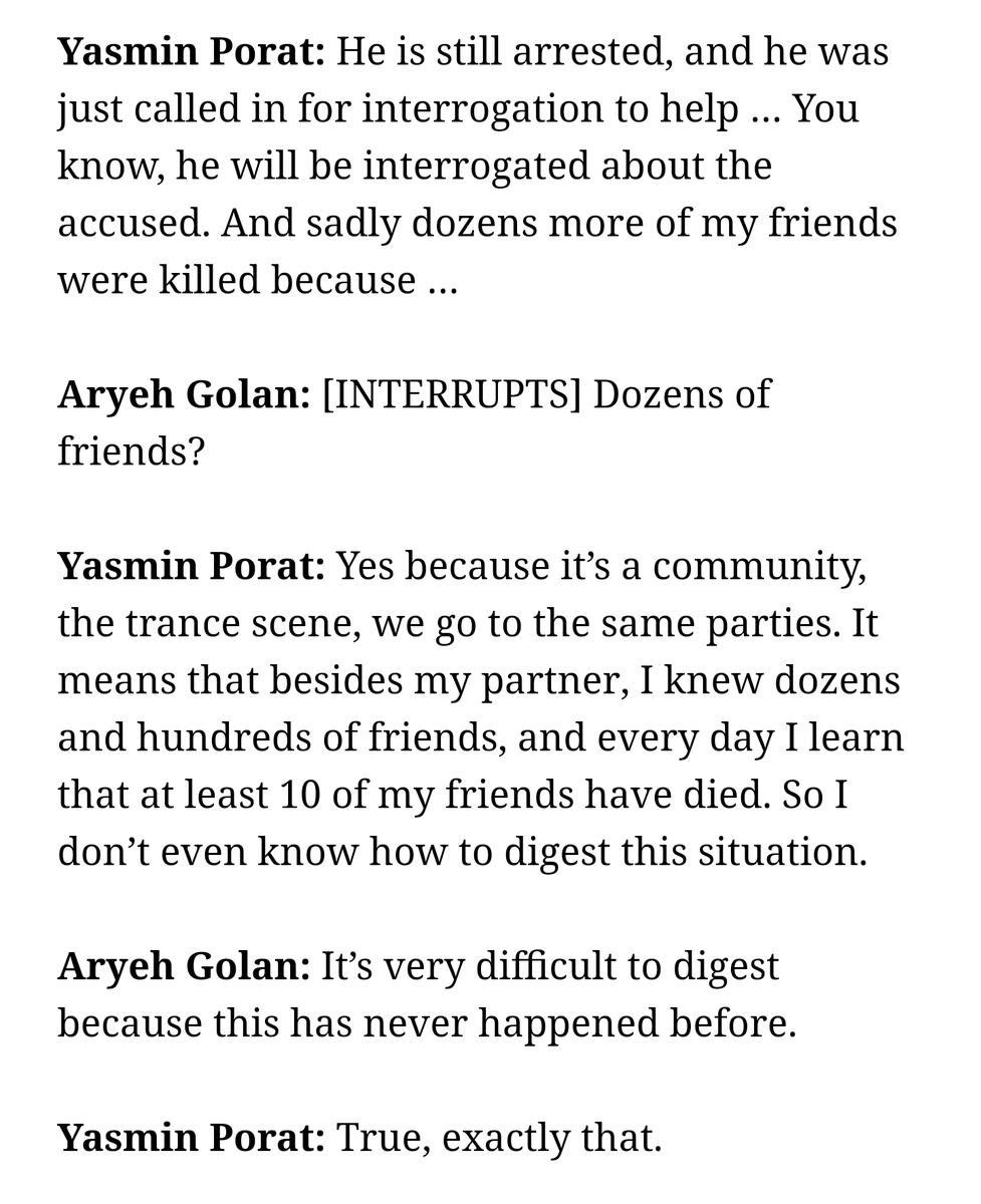 Yasmin Porat also just gave an interview to CNN where she retold some of this. She is stoll shocked and expresses thag she doesn't feel anything and it all feels like a dream. This is how Hamas-supporters lie to everyone, foremost to their own people.