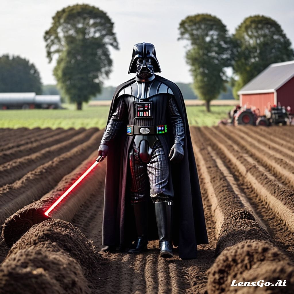 A portrait of Darth Vader working on the farm, looking at the camera, realistic, close up