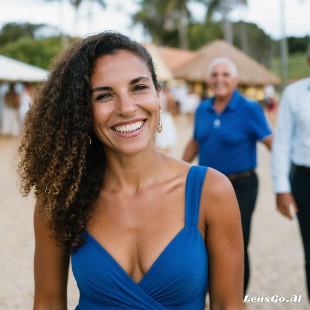 Brazil woman, smiling, wearing blue dress, portrait, Sony lens, Sony 35mm F1. 4, happy vibe
