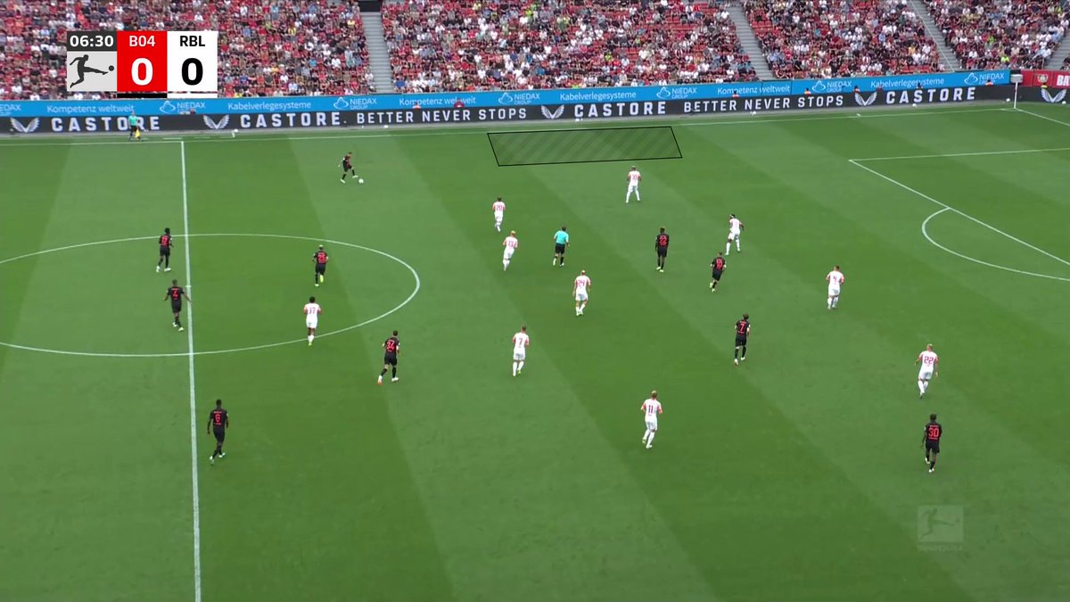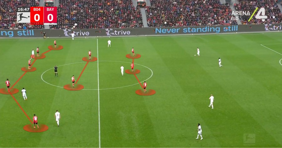 As discussed, Leverkusen build in a 4-2-4 from goal kicks and transition into a 3-2-5 in attack.