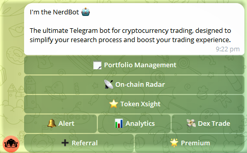 @0xNerdBot's features are amazing. They have 10s of features split into the different categories of Portfolio Management, On-Chain Radar, Token Xsight, Alert, Analytics, and DeX Trade.