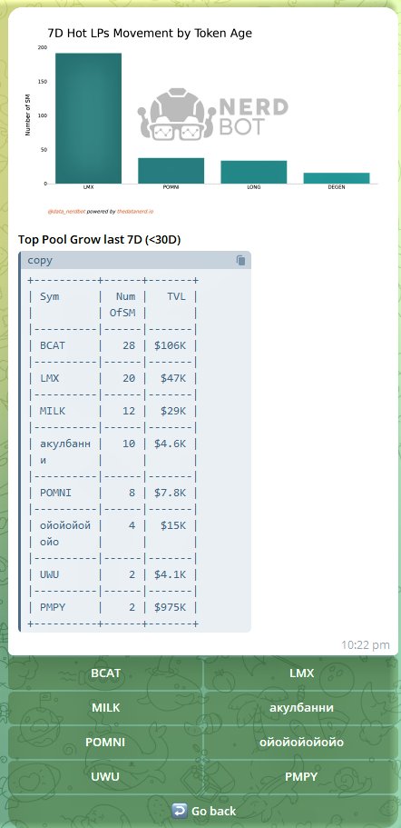 With the Hot Pool function, @0xNerdBot's On-Chain Radar identifies and shows you the Top Growing liquidity pools, and LP shifts giving you the information needed to spot trends and liquidity shifts.