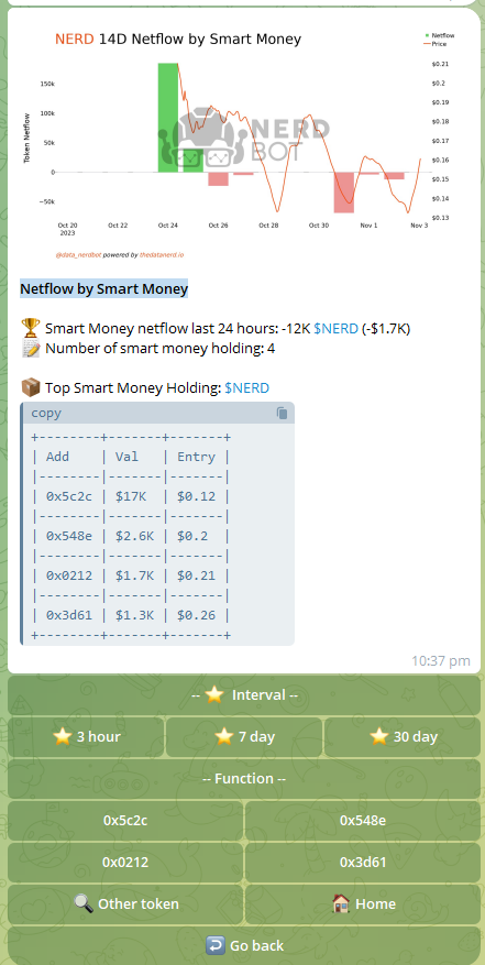 @0xNerdBot's Token Xsight feature provides a deep dive into individual tokens, showing you data about the token including which smart money and fresh wallets bought, a price chart, top gainers, top holders, exchange flows, a security check, @bubblemaps and early buyers. ππ¨βπ»