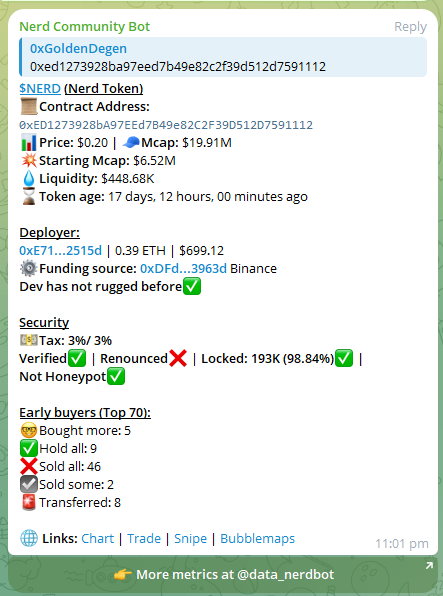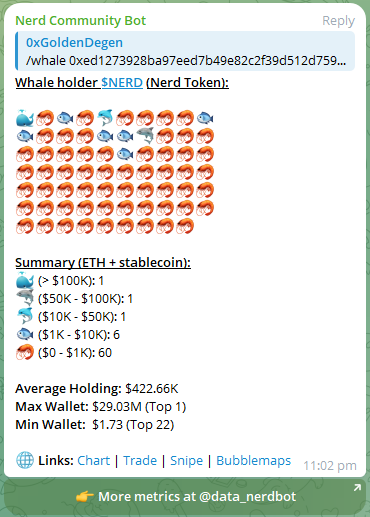 @0xNerdBot also has a community bot in the Nerdbot Official Community Telegram where you can utilize some of the features shown above as well as unique features. With the community bot, you can access it with simple commands like /c, /s, /p, /whale, etc.