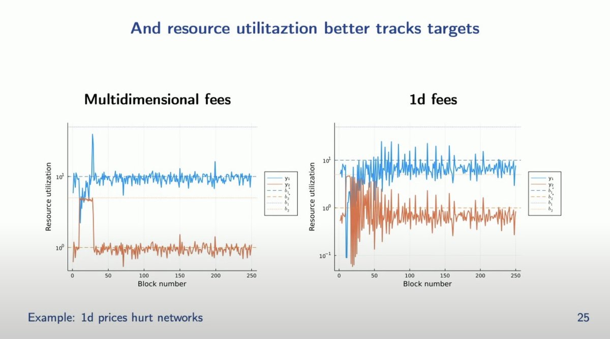 13/30 It is clear that fee markets with fixed relative prices (same price for access to orthogonal resource e.g. execution and compute) are inefficient and a multi-dimensional fee market is desirable. Here, @tarunchitra presents his work on "Designing Multidimensional Blockchain Fee Markets", co-authored with @theo_diamandis, @GuilleAngeris and @alexhevans, on a framework to optimally set multi-dimensional base fees.