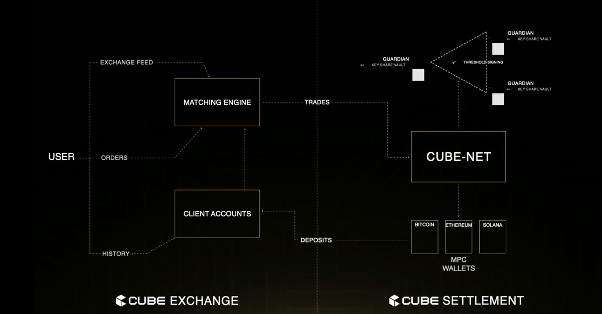 DEXes struggle getting adoption as self-custody is hard and liquidity is bad. Cube exchange fixes this. User funds are secured by a whole SVM-based network of guardians, who collectively control MPC wallets deployed on different chains. This allows to swap native $BTC for $ETH or $SOL without incurring bridging risks or dealing with wrapped assets.