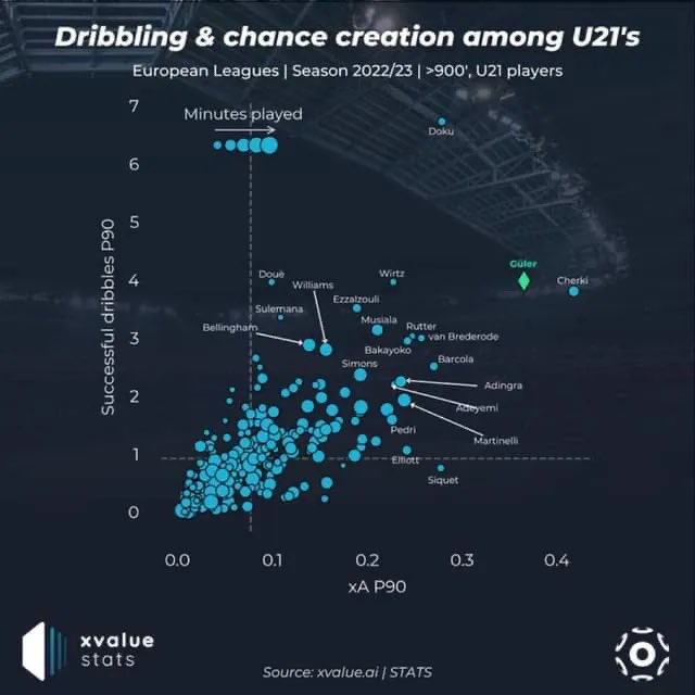 This put him ahead of various established youngsters like Musiala, Pedri, Wirtz…but ofc we need to take the fact that he plays in a much less competitive league into account. Yet, if we look at his UEL numbers alone, his xA per 90 was still recorded at 0.17 per 90,