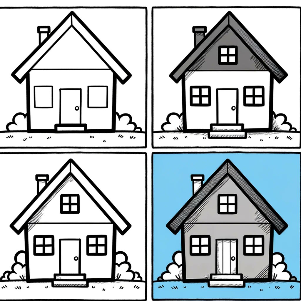 "Create a four-panel, square layout guide for drawing a simple cartoon duck.