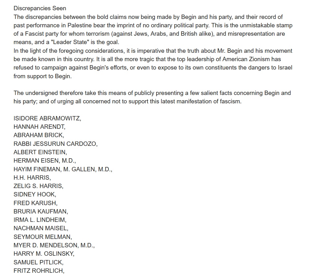 "Many of those who formed the Herut Party carried out terrorist attacks during the 1948 war that established the state of Israel. Albert Einstein, Hannah Arendt, Sidney Hook and other Jewish intellectuals, described the Herut Party in a statement published in The NYT ..