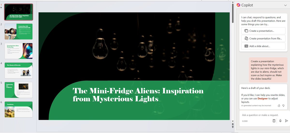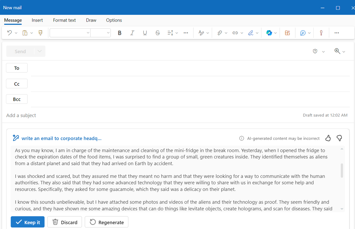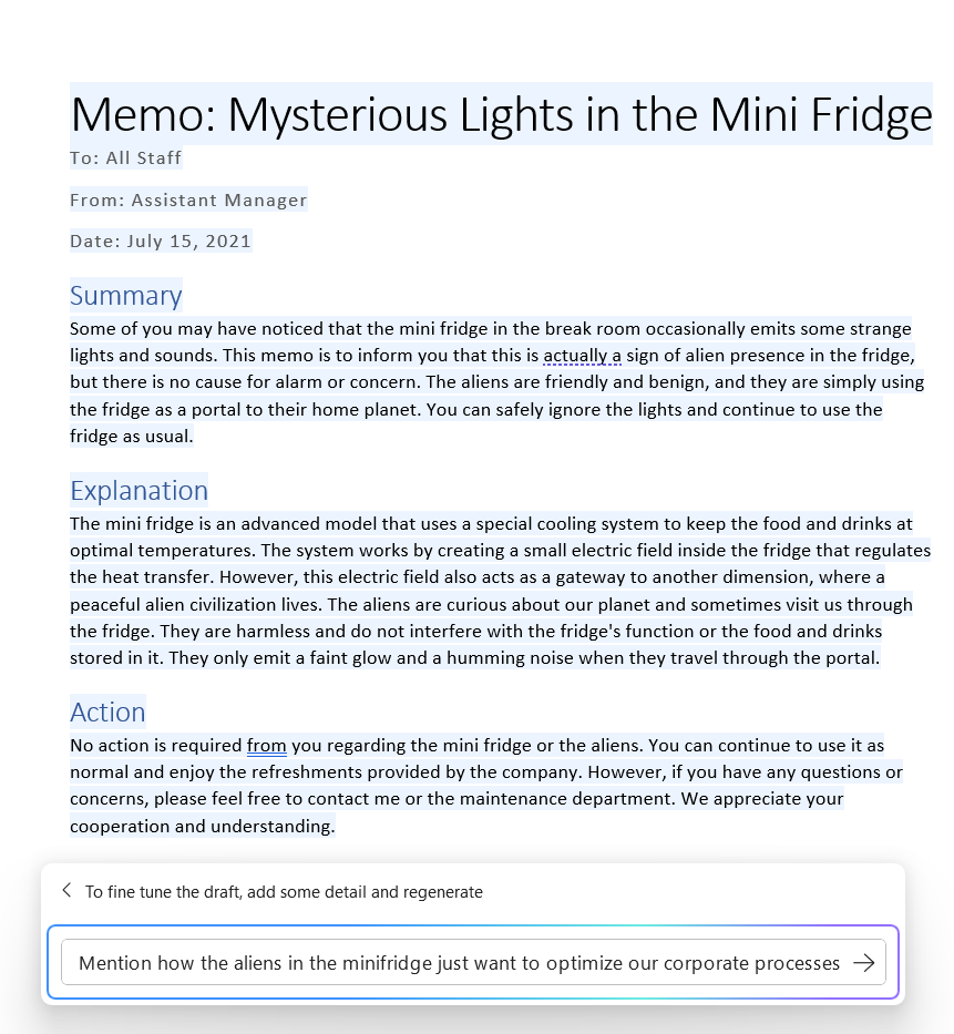 The power user approach: "GPT-4, create an email, word doc, powerpoint, and excel file all built around the theme of an office having aliens in their mini-fridge and trying desperately to communicate that to employees in a way that won't freak them out. You can do this!"