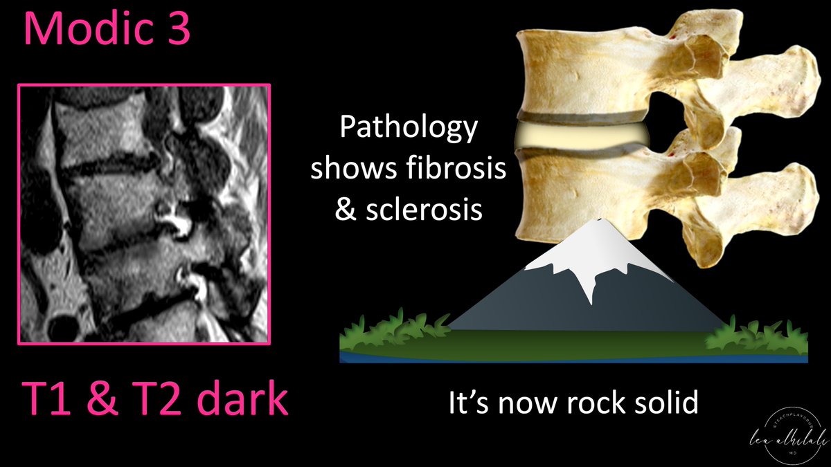 5/Modic 3 changes seem to be the endgame. These are dark on T1 & T2, indicating sclerosis—which is what you see on pathology: dense fibrous tissue & sclerosis. It’s like the endplates get fossilized—once you turn into rock, you are never going back.