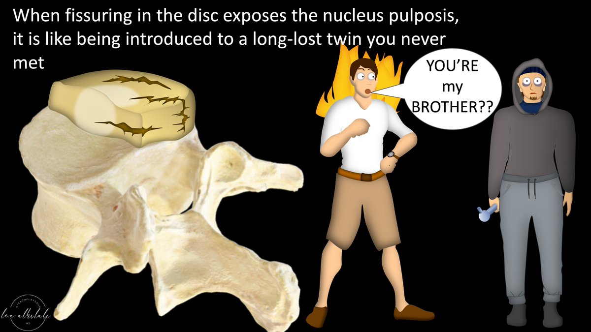 17/When the disc fissures & exposes the nucleus pulposis, it gets attacked as foreign by the immune system It’s the same way you would get inflamed if you met your long lost brother. You wouldn’t know him & you would freak out!