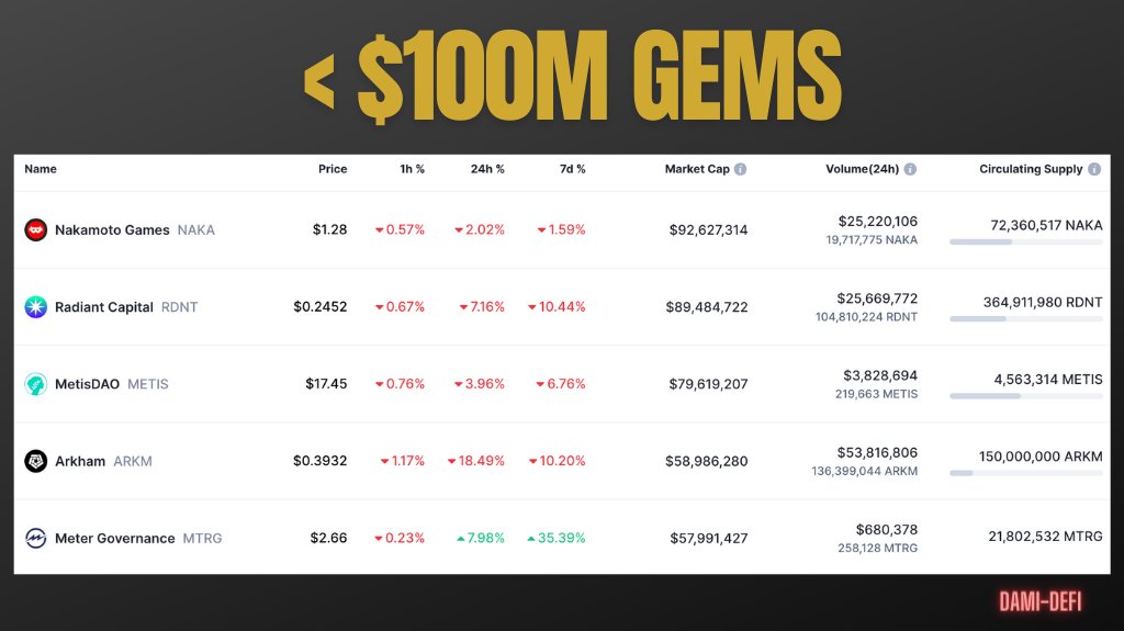 @symbiosis_fi @UniLend_Finance @blockbankapp @GameSwift_io @EverywhereFi @LayerZero_Labs @LybraFinance @XPRNetwork @Syntropynet @staderlabs @VelodromeFi @Chain_GPT @TeamUnibot @routerprotocol @FinanceChainge @triaslab @CamelotDEX @arbitrum 5️⃣ <$100M Gems