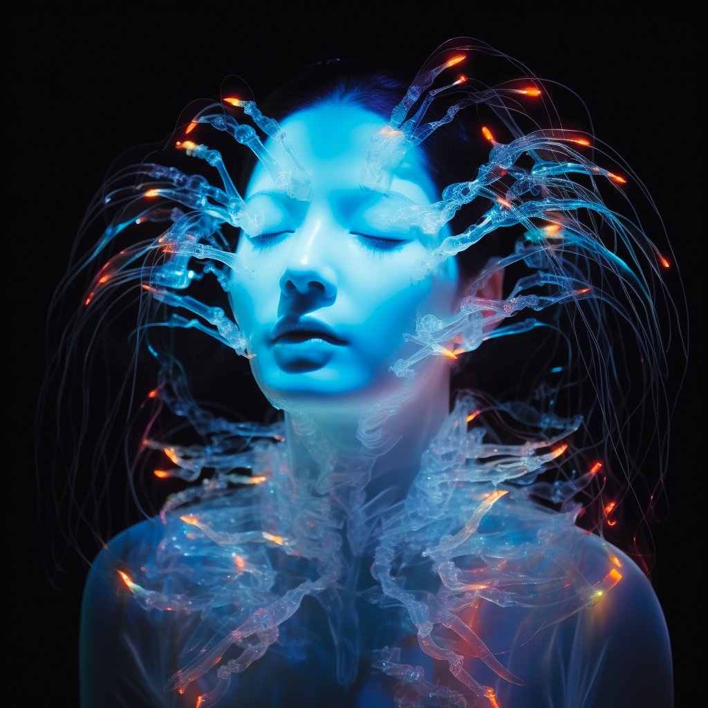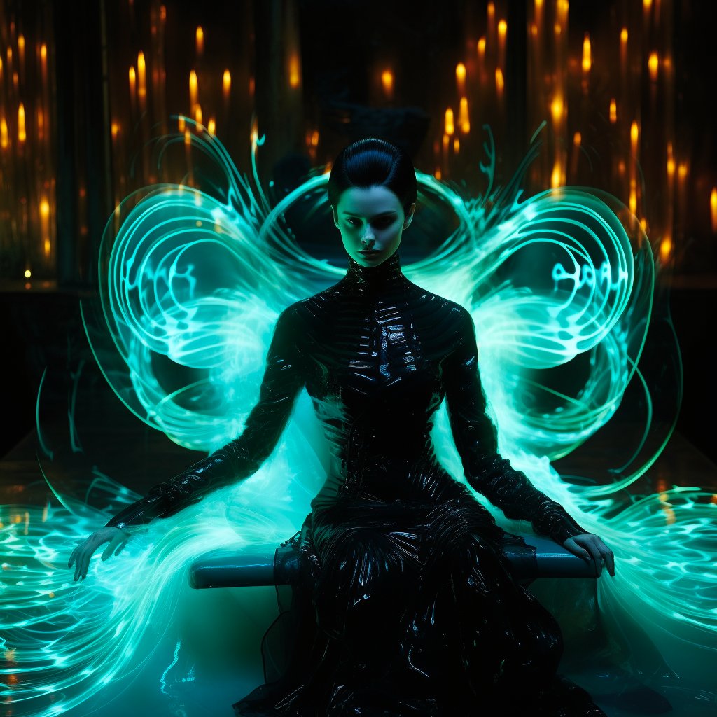 5. ✨Abramović's Timeless Echo, Blend her iconic performances with futuristic settings, wrapped in Bioluminescent glows and Fluorescent Paint.