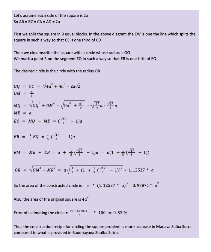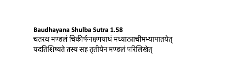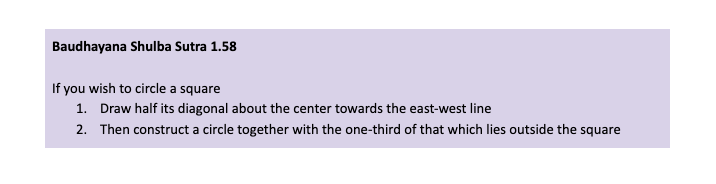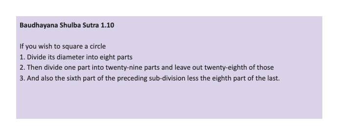 It is interesting to note that ancient Indian mathematicians were very aware of the approximate nature of this numerical recipe for circling the square