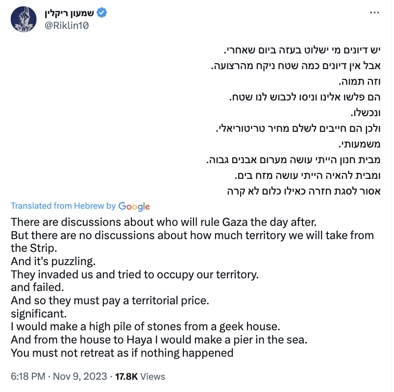 Calls to ethnically cleanse the Gaza Strip, to resettle it, for collective punishment, and other vile descriptions of violence, are rife.